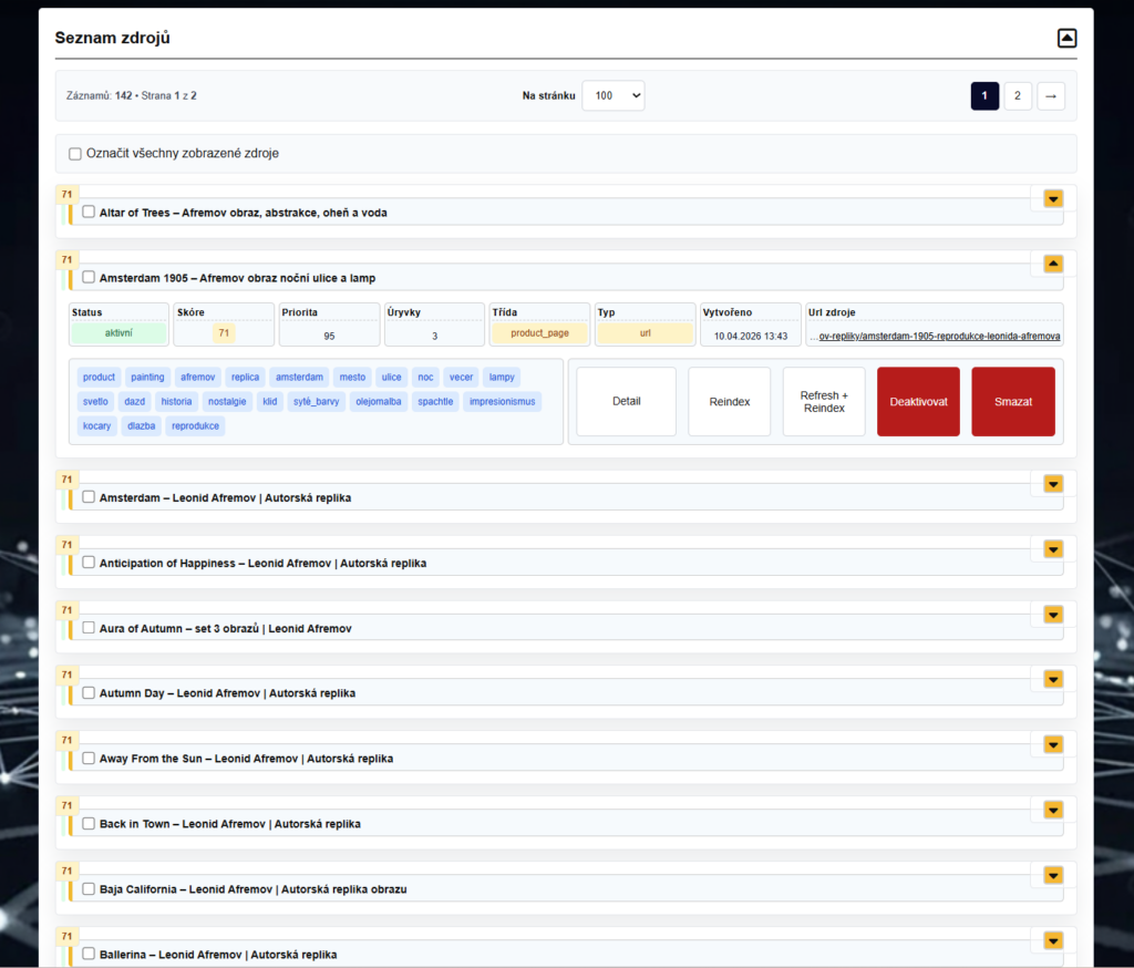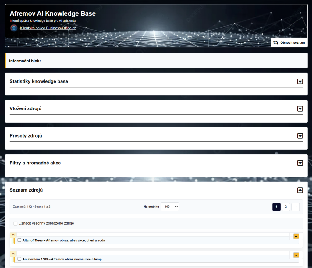 Každý zdroj obsahuje informace o typu stránky, tématu, emocích nebo vhodnosti použití. Díky tomu AI při dotazu neodpovídá obecně, ale pracuje s konkrétními relevantními daty.